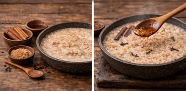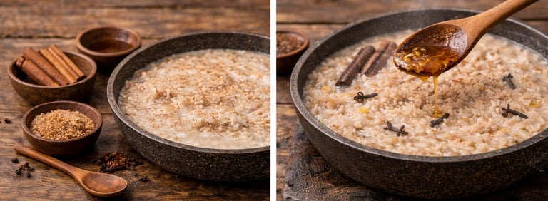 kuando el arroz ya este en un gran porcentage kosinado antes de ke seke, se le agrega canela, klavos o anis y una porsel de miel de kaña.